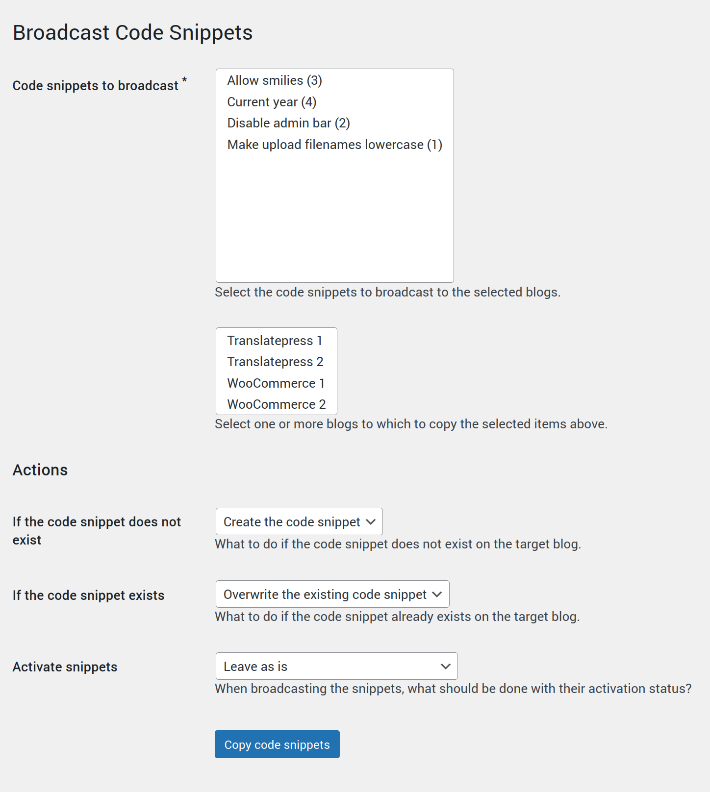 This add-on for Broadcast adds support for the Code Snippets Pro plugin.